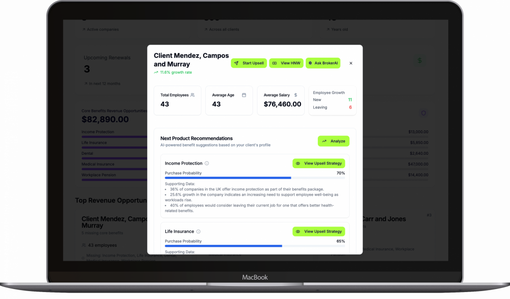 Visualise coverage penetration across core benefits, benchmark against similar clients, and highlight risk exposures.